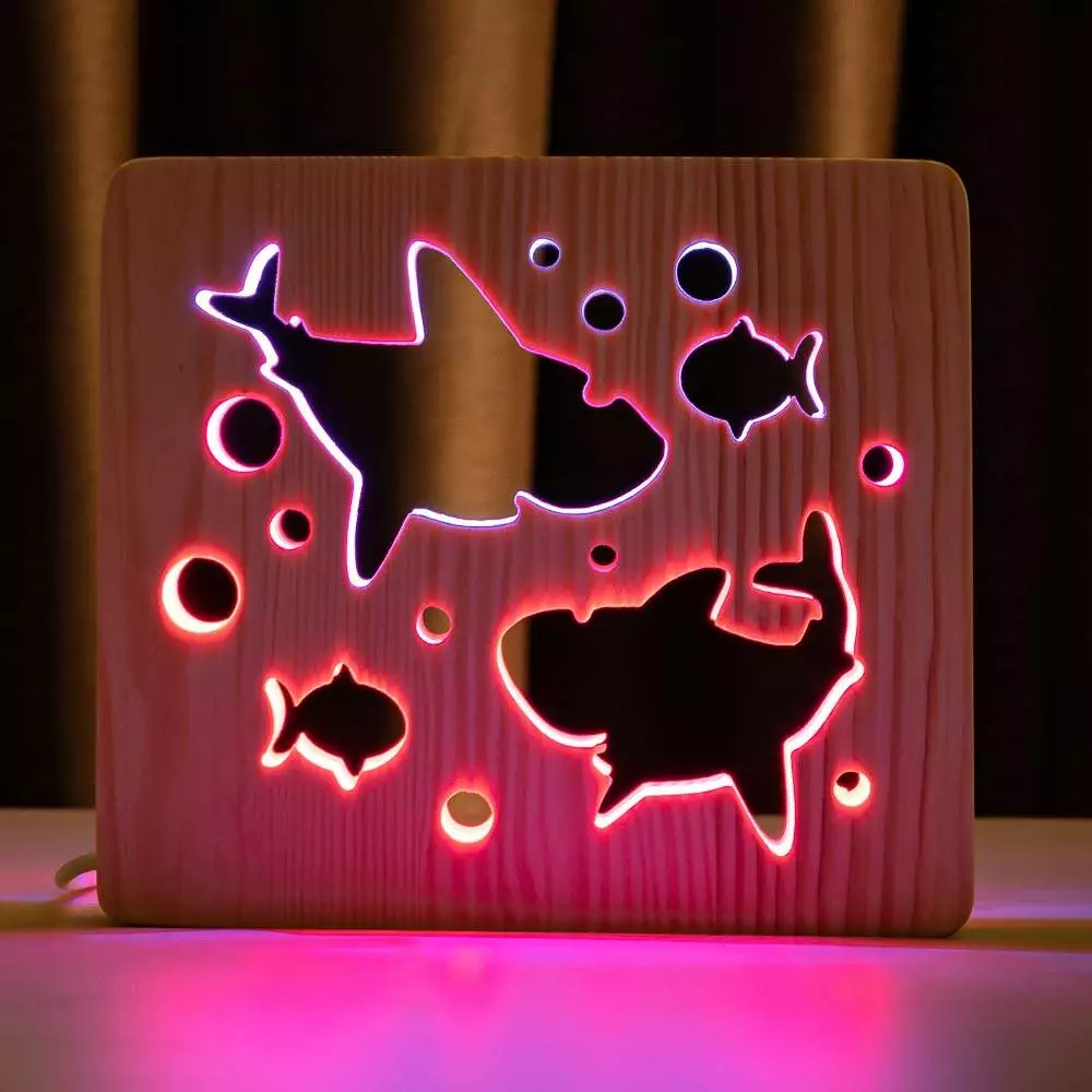 Світильник нічник ArtEco Light з дерева LED "Дві акули і рибки" з пультом та регулюванням кольору, подвійний RGB