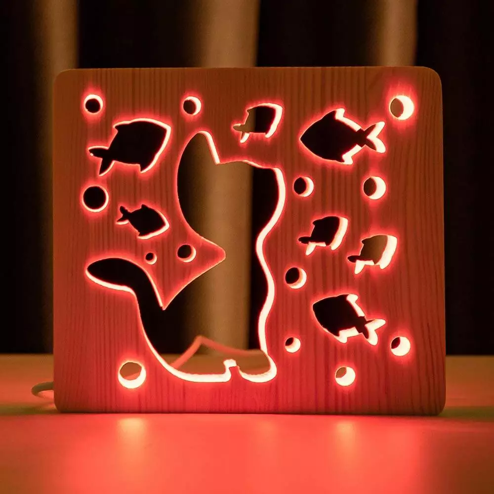 Світильник нічник ArtEco Light з дерева LED "Кіт та рибки" з пультом та регулюванням кольору, RGB