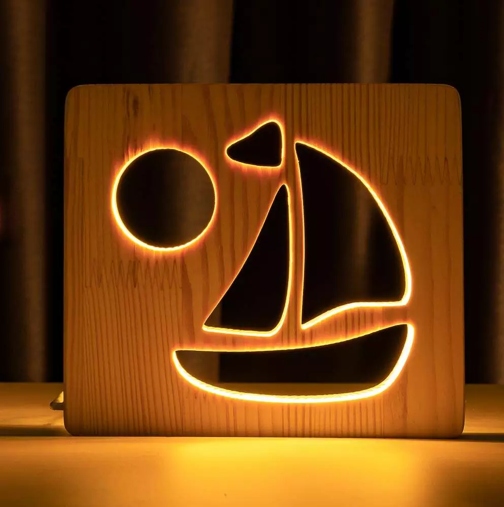Світильник нічник ArtEco Light з дерева LED "Кораблик" з пультом та регулюванням світла, колір теплий білий
