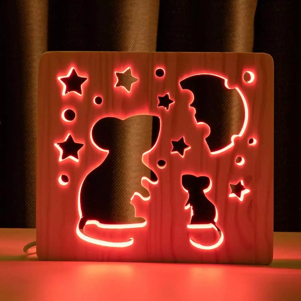 Настільний нічник з дерева, що світиться різними кольорами може використовуватися для дитячих кімнат як додаткове освітлення, а також як оригінальний елемент декору в будинку. В якості подарунка підходить для дітей дошкільного та шкільного віку. В асортименті широка лінійка нічників для вибору потрібного малюнка. За тематикою можна підібрати відповідно для хлопчиків або для дівчаток.